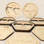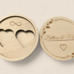 Ez az elegáns, természetes hatású gyűrűtartó doboz tökéletes kiegészítője az esküvő napjának. A fedélre lézerrel gravírozzuk a jegyespár nevét és az esküvő dátumát, így egy igazán személyes, örök emlék születik. A belső rész két gyűrű számára kialakított mélyedést tartalmaz, amely biztosan tartja a gyűrűket a szertartás alatt is. A dobozka fedeles, így biztonságosan tárolható benne a legfontosabb ékszer.