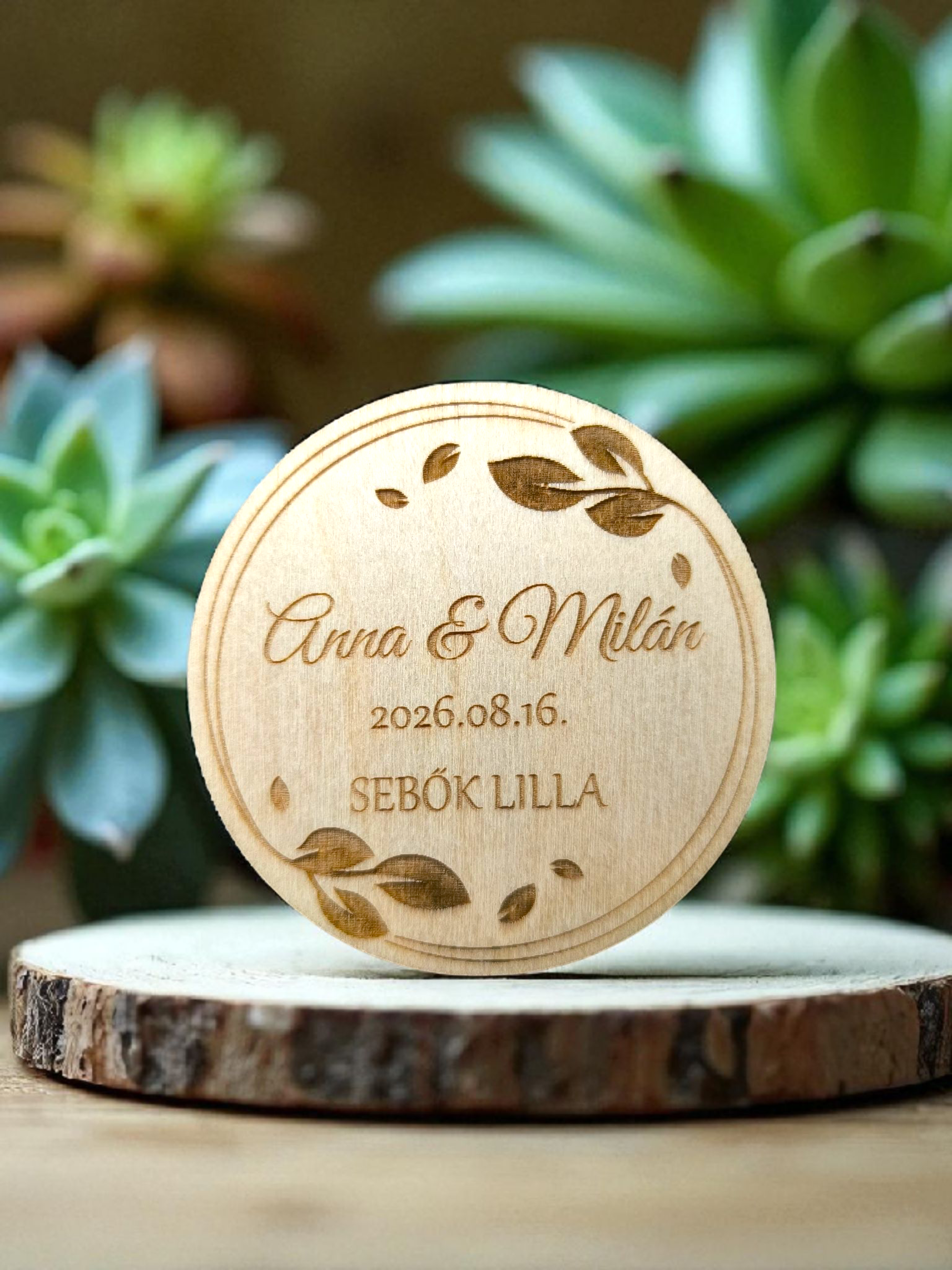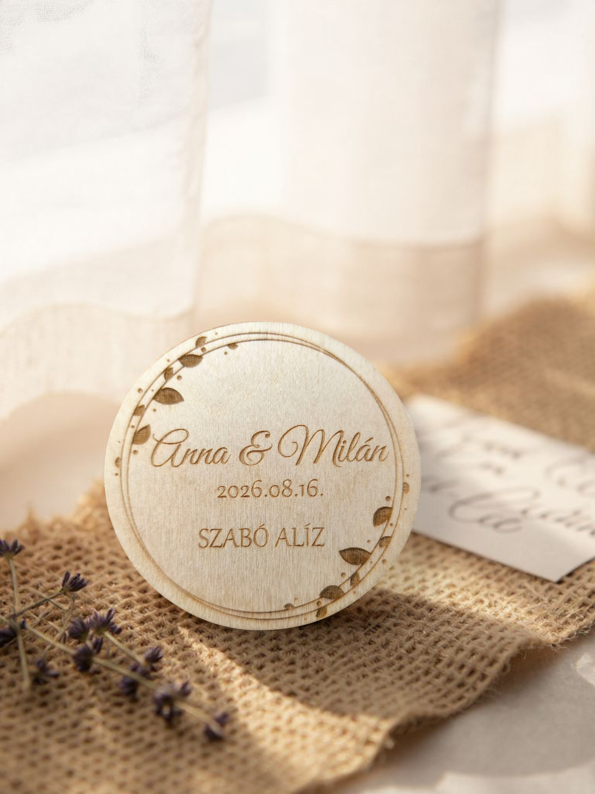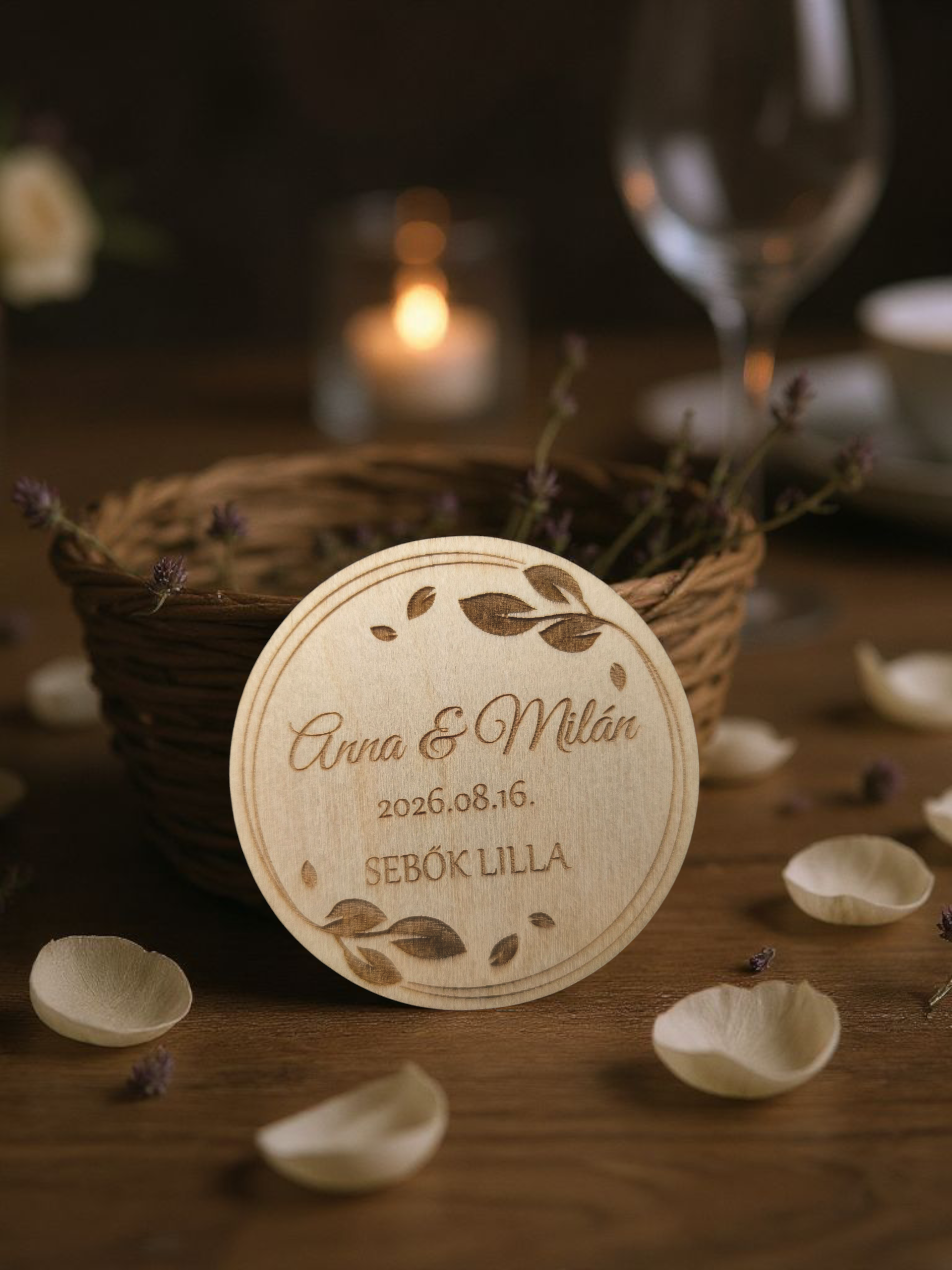 Ez a 3 mm-es nyír rétegelt lemezből készült, kör alakú ültető „korong” tökéletes választás, ha a dekorációban a stílus mellett a funkcionalitás is fontos. A gravírozott falapra rákerül a házaspár neve és a vendég neve, így egyszerre szolgál ültetőkártyaként, poháralátétként, és akár emlékként is hazavihető ajándékként. Letisztult, természetes megjelenésével jól illeszkedik rusztikus, vintage, vagy akár modern esküvői stílushoz is.